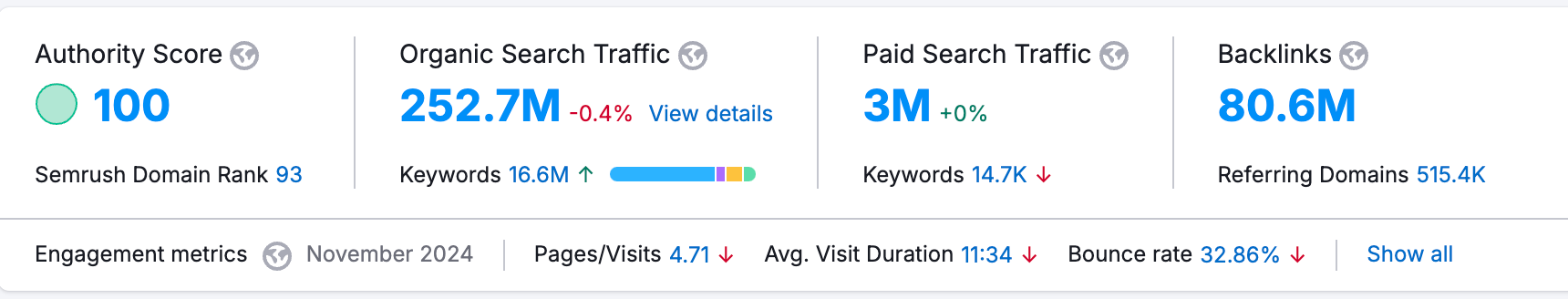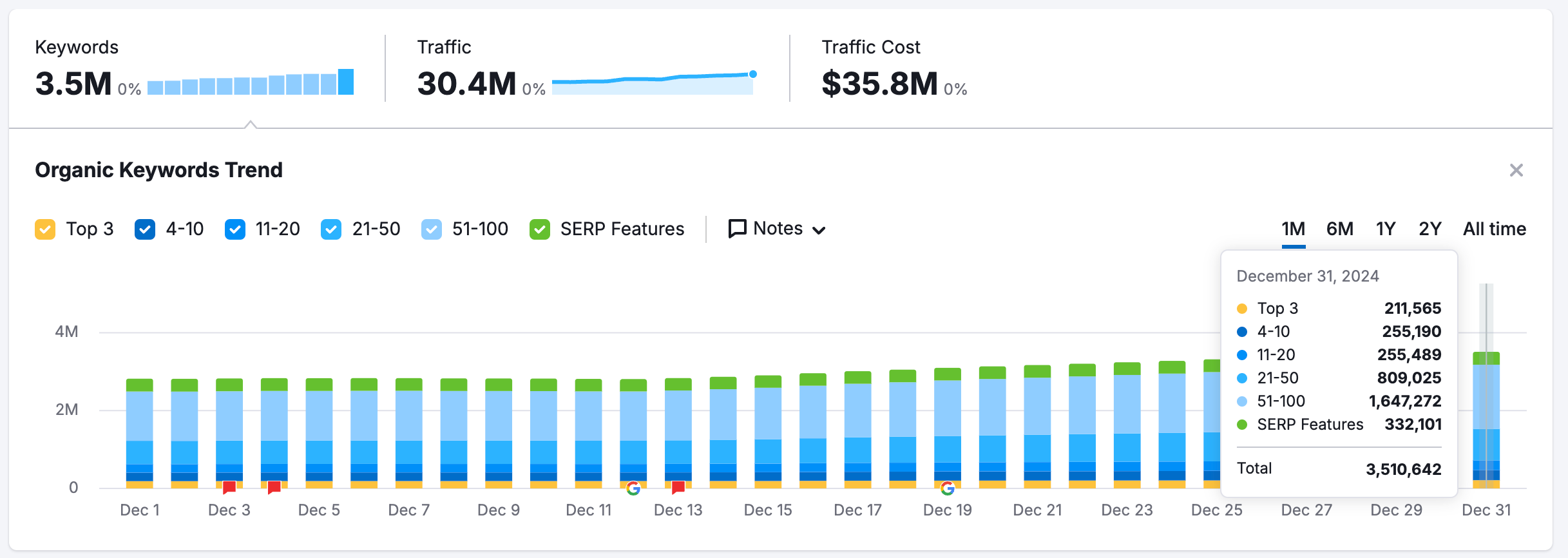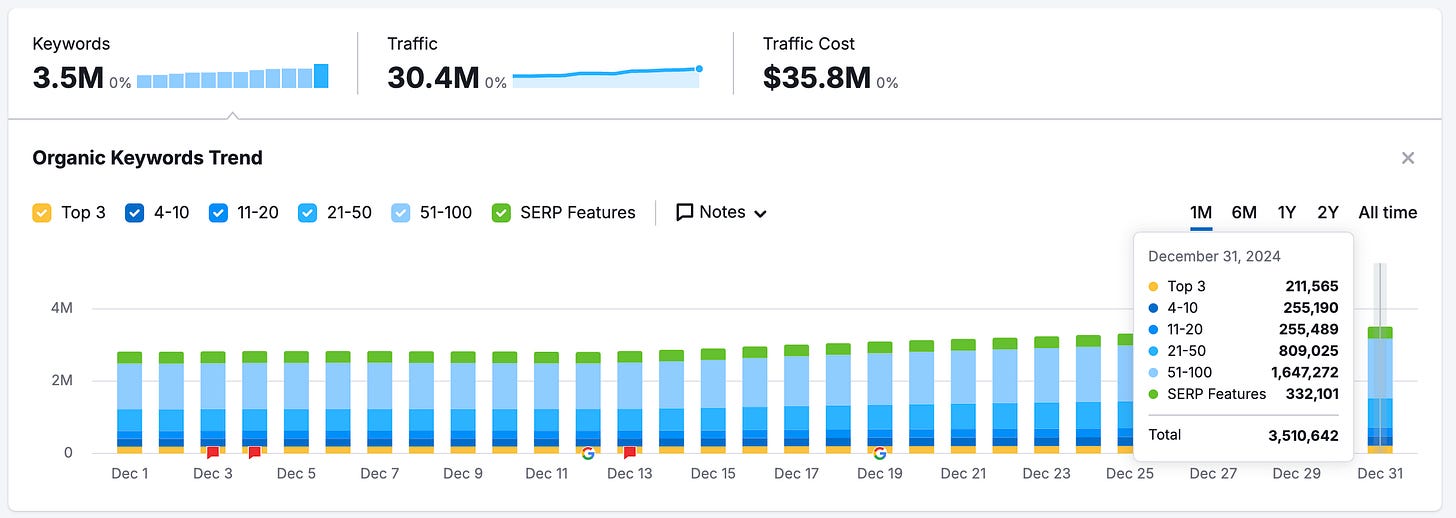 Canvaâs content efforts also had a significant impact on its organic search performance. Today, Canva ranks for over 3.5 million organic keywords, boasts an authority score of 100, and has accumulated 80 million backlinks pointing to its site. These metrics highlight Canvaâs dominance in organic search and its ability to drive high-quality traffic without relying heavily on paid advertising.