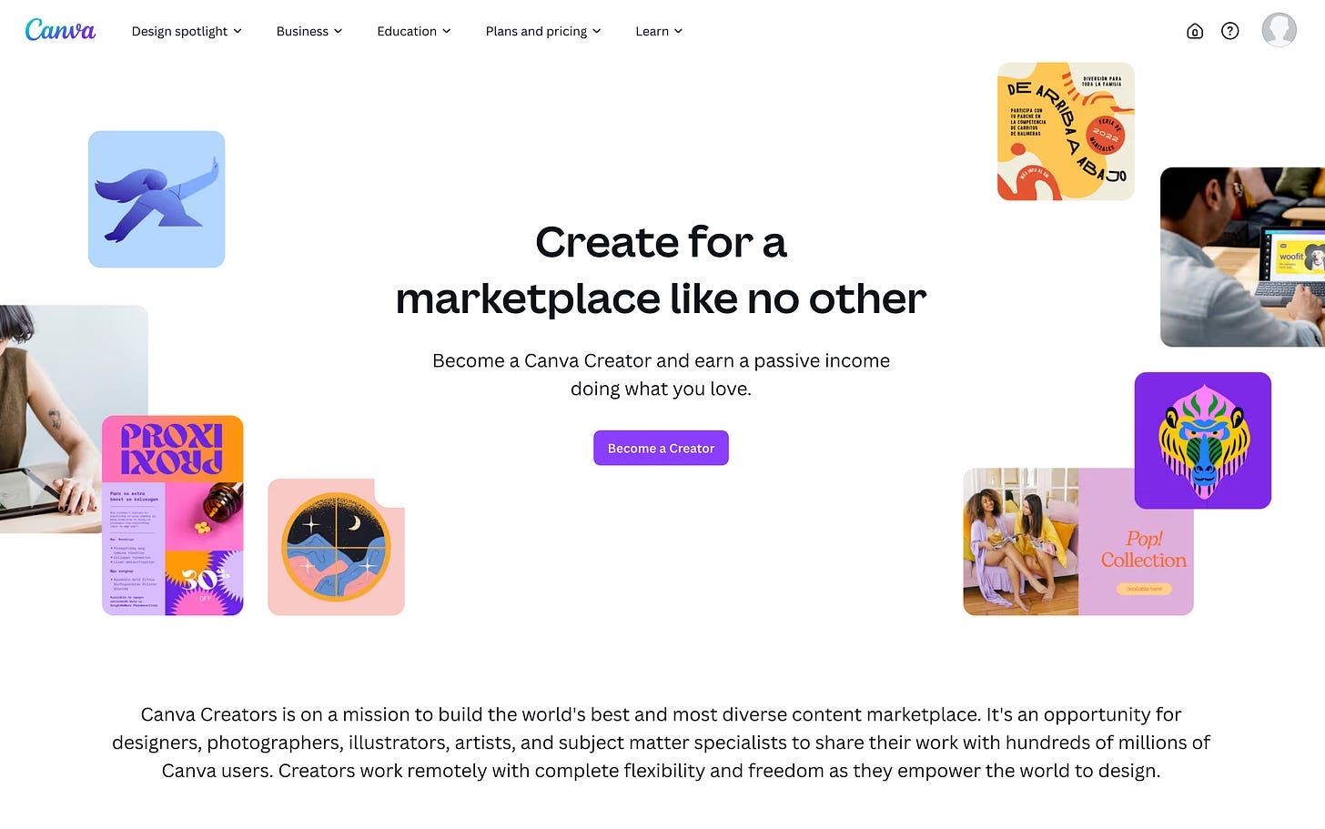 In 2012, Canva launched the Creators Program, a marketplace for designers, photographers, illustrators, and subject matter experts to share their work while earning passive income. This strategy turbocharged Canvaâs growth in several ways: