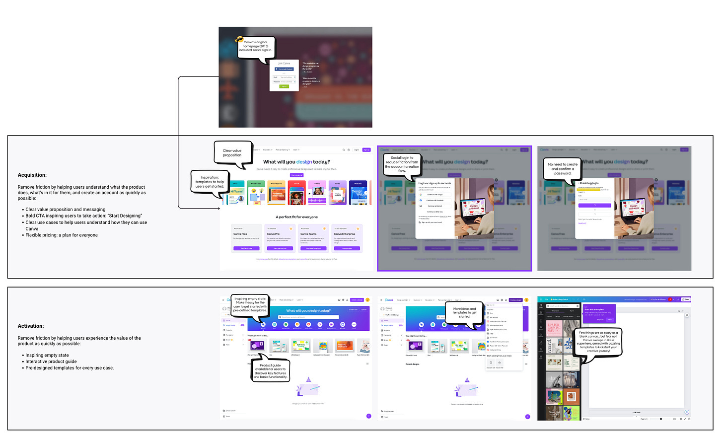 Hereâs a breakdown of Canvaâs onboarding, activation, and monetization flow.