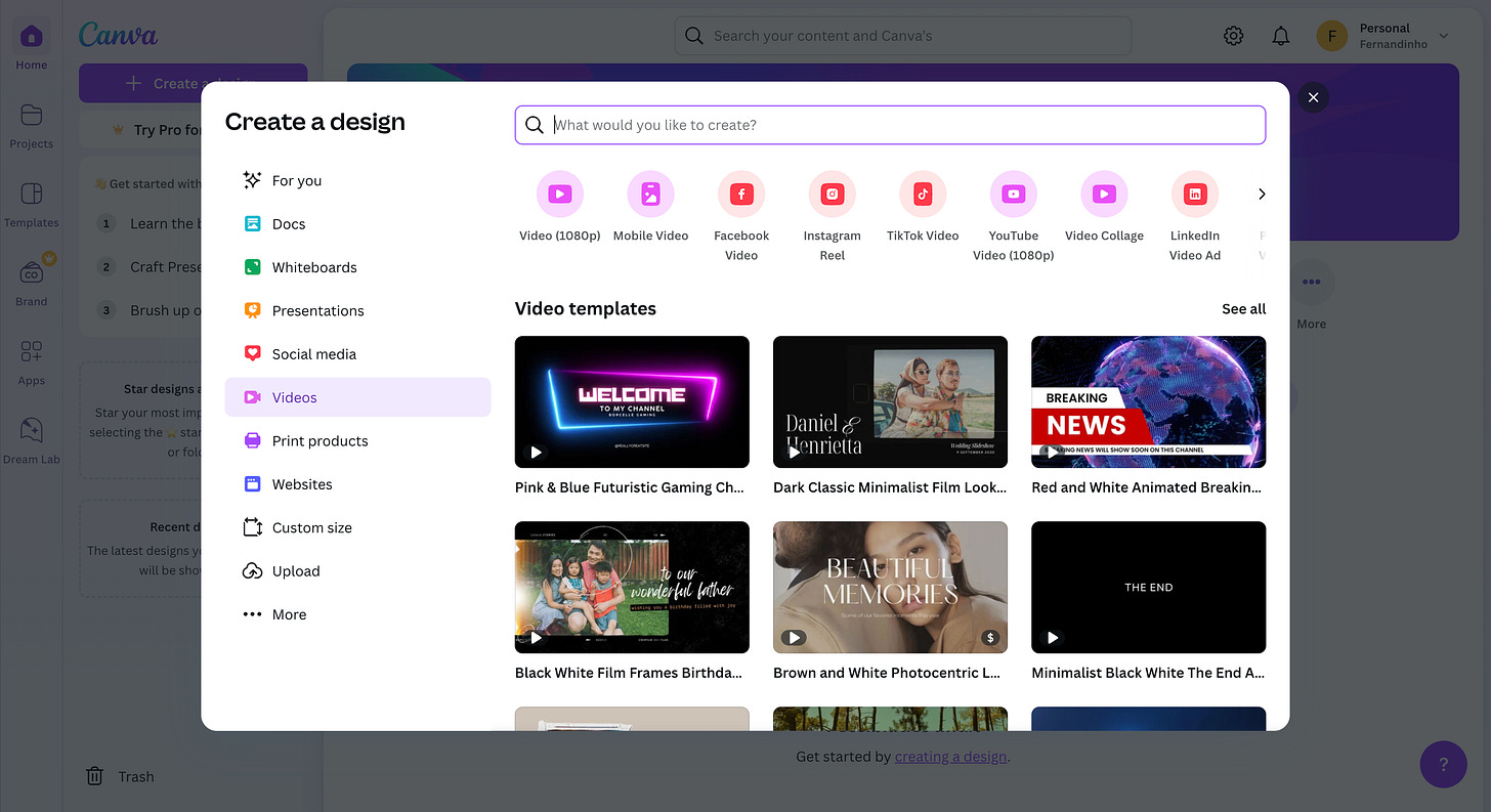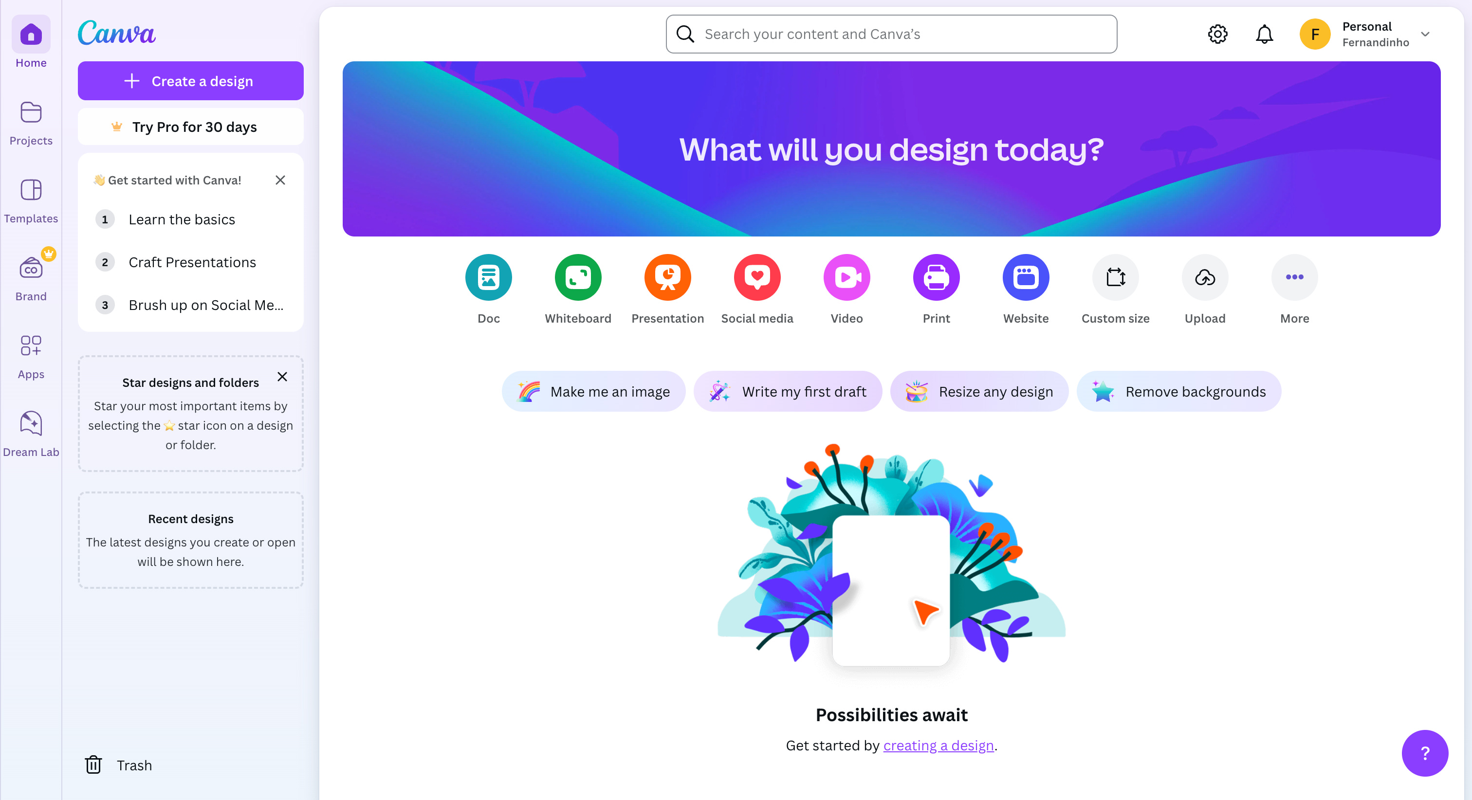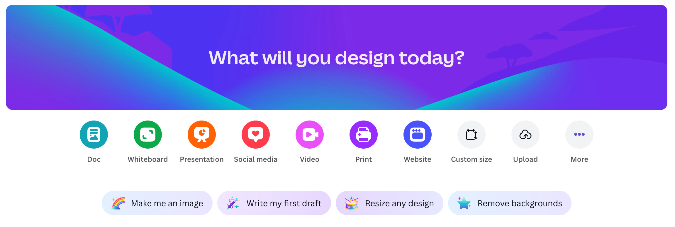 From the moment users sign up, Canva introduces its capabilities through clear and actionable CTAs, such as "Design me an image," "Write my first draft," "Resize any image," or "Remove backgrounds." These prompts address usersâ initial hesitations by offering quick wins that build confidence. Additionally, Canva guides users to create specific types of contentâlike presentations, social media posts, or videosâdirecting them to a vast library of templates tailored to their needs. This approach ensures users feel empowered to start creating immediately, reducing friction and accelerating their journey to value.
