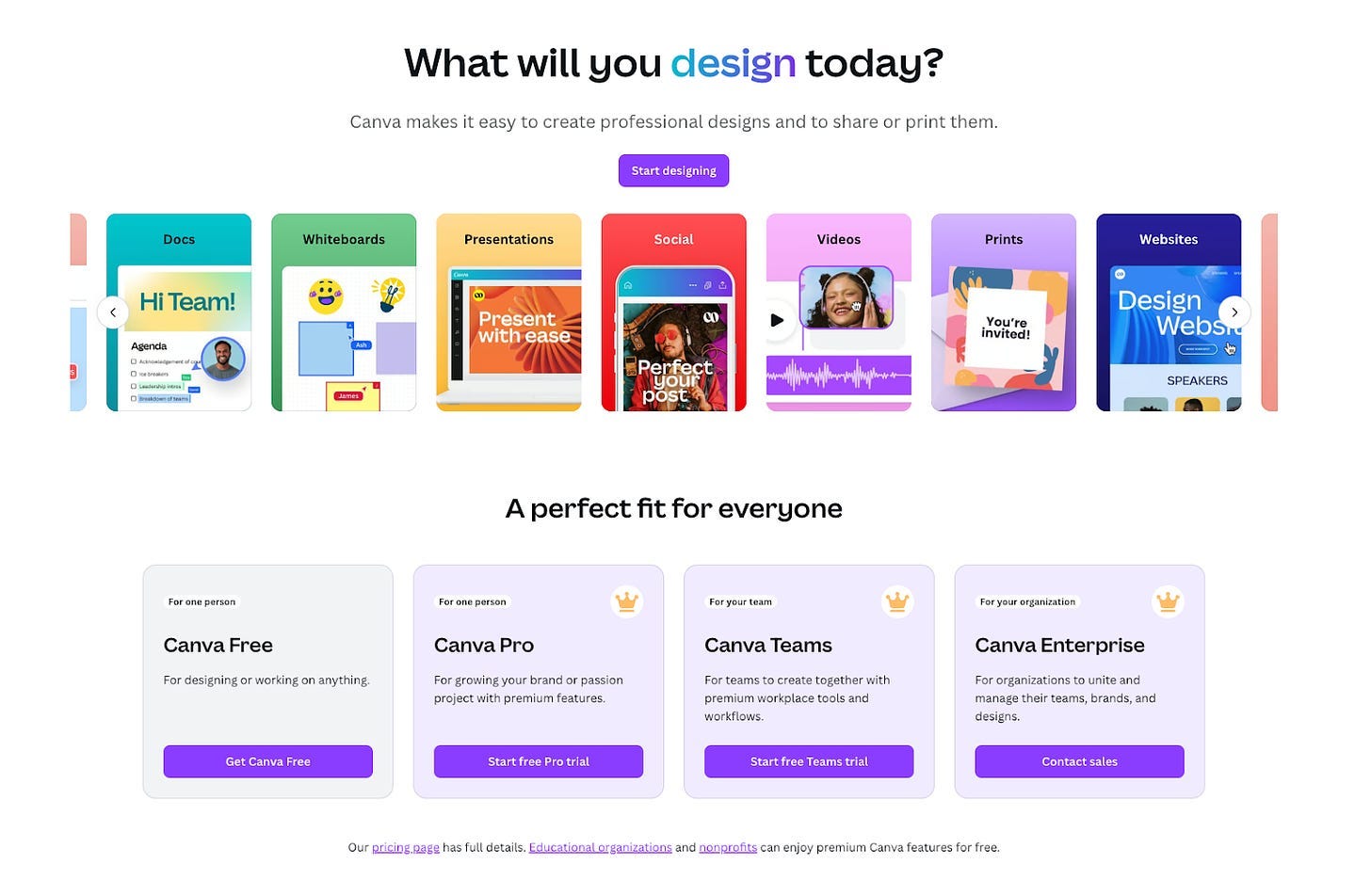 Canvaâs messaging and positioning has remained consistent throughout the years, and itâs a clear representation of how the company understands the fears and concerns of its users â to see an evolution of Canvaâs homepage and web experience, check out this post from Gallantway. An example of this is the main Header on their homepage âWhat will you design today? Canva makes it easy to create professional designs and to share or print themâ, which tackles the main concern of users head-on by (1) encouraging them to get started and (2) makes it easy to do so with preloaded templates to spark inspiration.