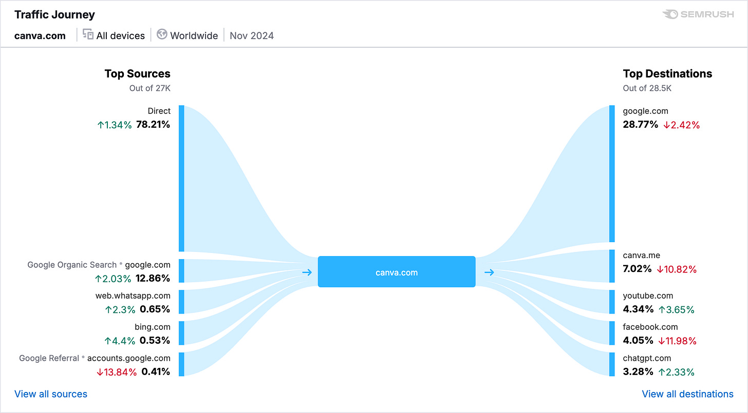 This strategy did more than drive conversions; it also fueled Canvaâs organic growth. As users created and shared designs, Canvaâs content began ranking for similar search terms, gradually reducing its reliance on paid channels. Today, only 7% of Canvaâs total site traffic comes from paid sourcesâa testament to the long-term impact of this efficient SEM strategy.